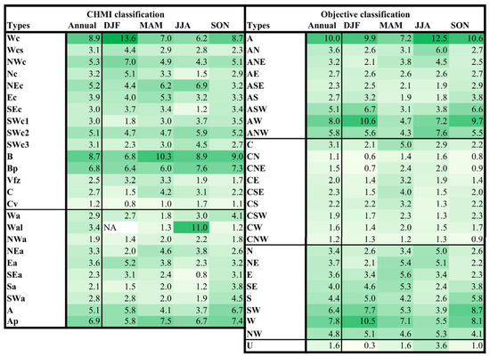 Relative annual and seasonal (DJF: December–February; MAM: March–May; JJA: June–August; and SON: September–November) occurrence frequencies (%) of the individual circulation types under the CHMI and objective classifications in the Czech Republic during the 1961–2020 period. The values are highlighted by the color scale of green shades.