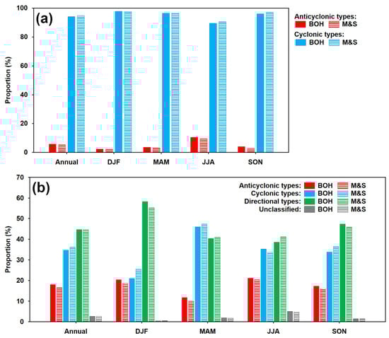 Relative annual and seasonal (DJF: December–February; MAM: March–May; JJA: June–August; and SON: September–November) proportions (%) of the groups of circulation types under the CHMI (a) and objective (b) classifications in the overall precipitation totals in Bohemia (BOH) and Moravia and Silesia (M&S) during the 1961–2020 period.