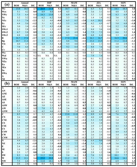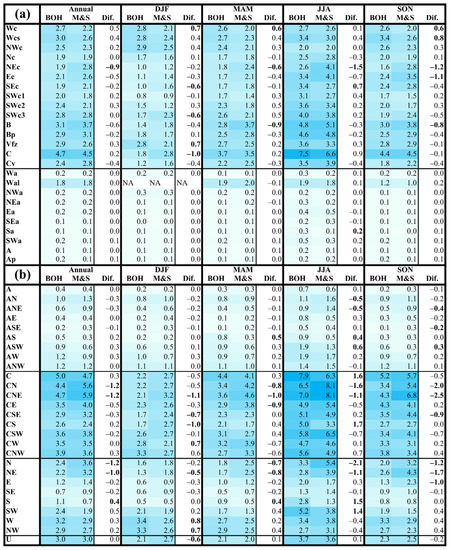 Annual and seasonal (DJF: December–February; MAM: March–May; JJA: June–August; and SON: September–November) probabilities of days with precipitation totals ≥ 1.0 mm for the individual circulation types under the CHMI (a) and objective (b) classifications in Bohemia (BOH) and Moravia and Silesia (M&S) and differences (Dif) during the 1961–2020 period. Statistically significant differences at the 0.05 significance level are denoted in bold type. The values are highlighted by the color scale of blue shades.