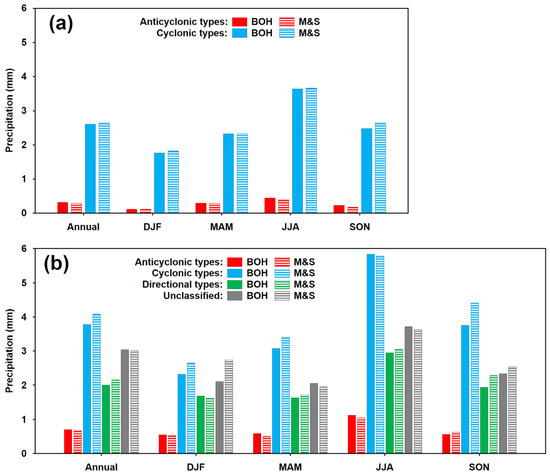 Regarding the objective classification, the group of cyclonic types achieved the highest mean daily totals throughout the year (3.8 mm in BOH and 4.1 mm in M&S) and in all seasons except DJF, when the unclassified type U attained almost the same value in M&S (Figure 7b). The directional circulation types exhibited lower means (2.0 mm in BOH and 2.2 mm in M&S annually), with the values reaching roughly half of daily totals for the cyclonic types in all seasons, except in DJF when the totals for the directional types were closer to those for the cyclonic types. The anticyclonic types yielded mean daily totals of approximately 1.0 mm in JJA and approximately 0.5 mm in the remaining seasons.