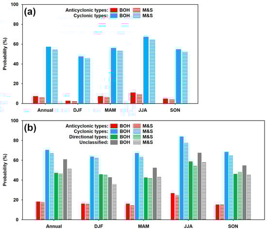 Annual and seasonal (DJF: December–February; MAM: March–May; JJA: June–August; and SON: September–November) probabilities of days with precipitation totals ≥ 1.0 mm for the groups of circulation types under the CHMI (a) and objective (b) classifications in Bohemia (BOH) and Moravia and Silesia (M&S) during the 1961–2020 period.