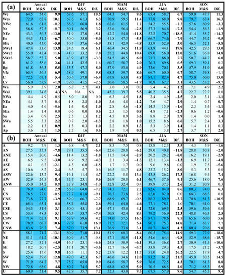 Relative annual and seasonal (DJF: December–February; MAM: March–May; JJA: June–August; and SON: September–November) proportions (%) of the individual circulation types under the CHMI (a) and objective (b) classifications in the overall precipitation totals in Bohemia (BOH) and Moravia and Silesia (M&S) and differences (Dif) during the 1961–2020 period. Statistically significant differences at the 0.05 significance level are denoted in bold type. The values are highlighted by the color scale of blue shades.