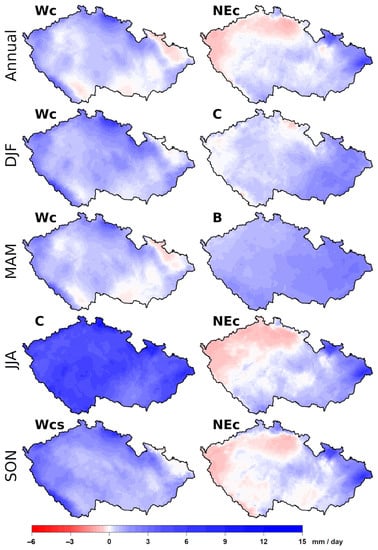 Type Wc exhibited the largest differences in the mean daily totals in favor of BOH in DJF and MAM with a similar spatial distribution to that throughout the year, although there occurred a higher anomaly in DJF in general, and negative values were only detected in a small area (Figure 11). In addition, the NEc type caused the largest difference in favor of M&S in JJA and SON with a similar distribution to the annual distribution, but with a higher west–east gradient in JJA. Type C revealed different patterns of the spatial distribution between the two parts of the Czech Republic. In DJF, a much higher anomaly occurred in M&S with a more homogeneous spatial distribution, and the lowest anomalies were observed in the mountains and western part of BOH. In contrast, type C transported more precipitation to BOH in JJA, with the lowest anomalies observed in the lowlands of M&S. Slight effects of the orography occurred for type B in MAM, favoring the daily totals in M&S, producing above-mean totals across the entire Czech Republic, but an increasing west–east precipitation gradient was generated. The Wcs type, causing the largest difference in favor of BOH during SON, exhibited a very similar spatial distribution to that of the Wc type but with slightly higher values of the anomalies.