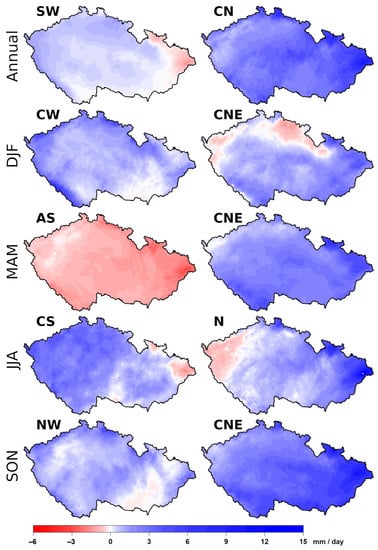 The gridded (500 m × 500 m) daily precipitation totals were further employed to investigate the spatial distribution of precipitation under the individual circulation types across the territory of the Czech Republic. Mean daily precipitation totals under a given circulation type were expressed in each grid as anomalies in regard to the corresponding overall annual or seasonal daily means calculated over the 1961–2020 period. The obtained anomalies were used to create corresponding maps of the individual circulation types, and only those circulation types with the largest positive and negative differences between BOH and M&S throughout the year and during the four seasons are presented in Section 3.5 (see Figures 11 and 12).
