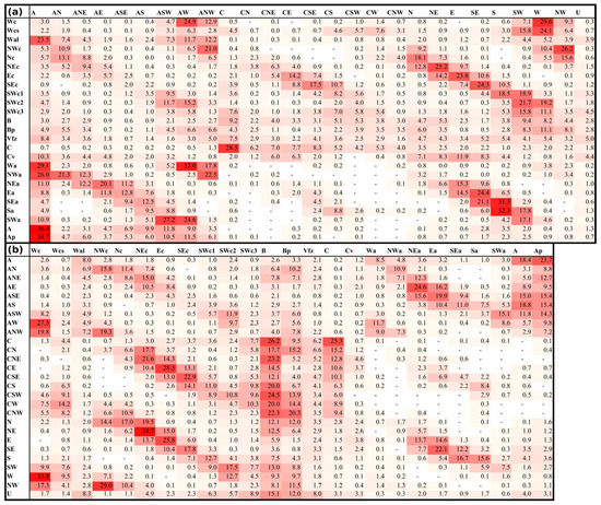 Relative occurrence frequencies of the individual circulation types under the objective classification to the occurrence frequencies of the individual types under the CHMI classification (a) and vice versa (b) during the 1961–2020 period. The values are highlighted by the color scale of red shades.