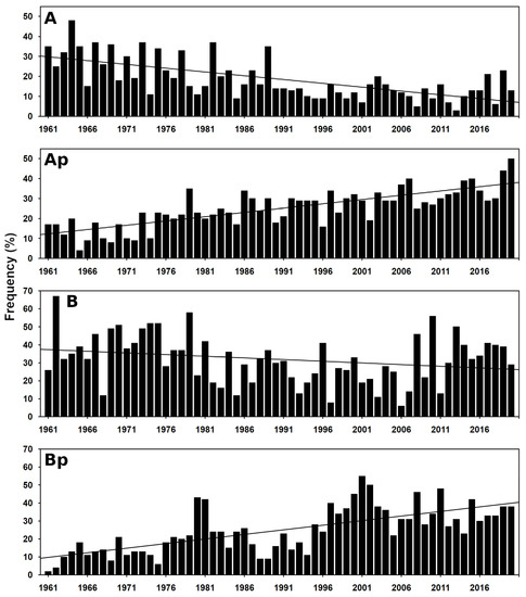 Fluctuations in the occurrence frequencies of the CHMI types (A) (anticyclone over Central Europe), (Ap) (travelling anticyclone), (B) (trough over Central Europe), and (Bp) (travelling trough) and their linear trends during the 1961–2020 period.