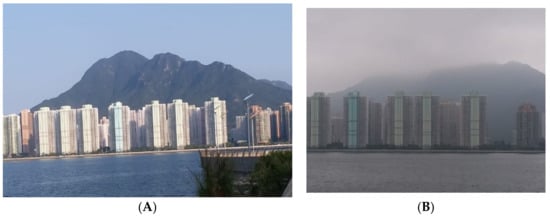 (A) Far view of residential estates and Mount Ma On along the Shing Moon River of Shatin, Hong Kong on clear day with PM2.5 concentration of 14 µg/m3, and (B) on foggy polluted day with PM2.5 concentration of 45 µg/m3 (Woo et al. [18]).