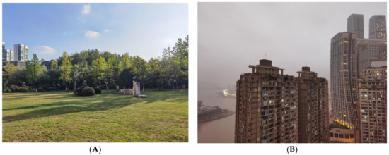 (A) Sky view of Chongqing Garden on clear day with PM2.5 concentration of 45 µg/m3, and (B) Chongqing residence estate near riverside on a foggy day with PM2.5 concentration of 79 µg/m3 (Courtesy of Prof. YH Yin).