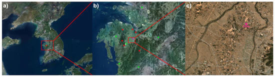 (a) Satellite image of Korea provided by KakaoMap. (b) Weather station sites of the Korea Meteorological Administration (red circles: automatic weather station, green circles: Automated Synoptic Observing System, pink star: Yesan weather station). (c) Satellite image of study area in April 2020, provided by Planet Lab, and location of weather station (pink star).