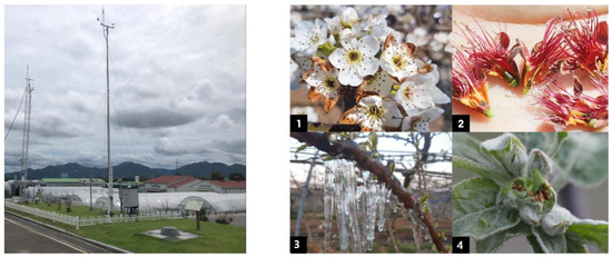 Left panel is two automatic weather stations of Korea Meteorological Administration (right tower) and Rural Development Administration (left tower) at the study area shown in Figure 1c. Right panels show crop damages due to sudden low temperature or frost (1: The petals of pear blossoms and the top of the ovary turned black; 2: Peach flowers that turned dark red; 3: The icicles on the pear tree and the frozen spray water; 4: The apple, which is in the state of a bud, turned yellow in the temperature that fell below zero (Source: © Nongmin News Corp. with photographs by Gyo-Hyun Chu).