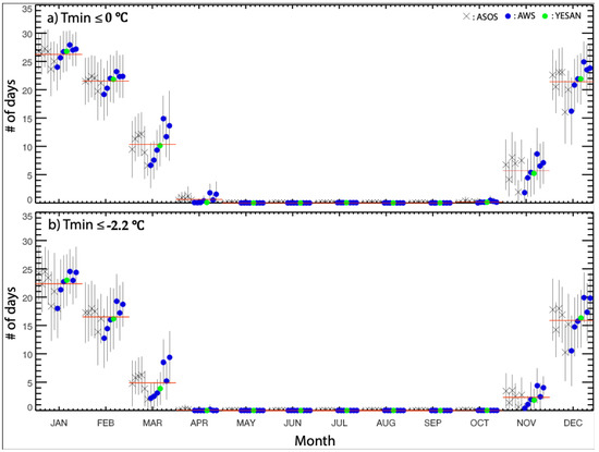 Number of days with the minimum temperature (Tmin) (a) below 0 °C and (b) below −2.2 °C noted at each observation station (x, ASOS; blue filled circle, AWS; and green filled circle, YESAN). Red lines represent the average of the 13 stations for each month and black bars show standard variation of each station.