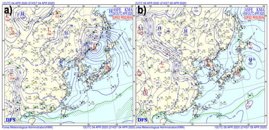 The 12 UTC (21 LST) surface weather chart for (a) 4 April 2020 and (b) 9 April 2020.