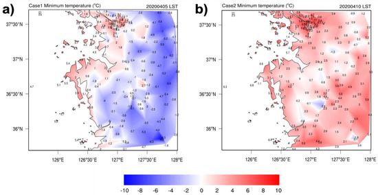 Daily minimum temperature (°C) on (a) 5 April 2020 (Case 1) and (b) 10 April 2020 over the study domain (Case 2).