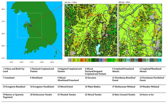 A 30-arcsecond United States Geological Survey (USGS) land-use and topography dataset was used for domains 1 and 2. The spatial resolution of domains 3, 4, and 5 was higher than 30 arcseconds. Therefore, 1/3 arcsecond land-cover data provided by the Ministry of Environment of Korea and 1/3 arcsecond topography data provided by the National Geographic Information Institute were used (Figure 6).