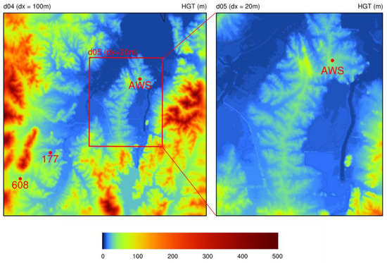 The WRF–LES modeling results from domain 4 (dx = 100 m) and domain 5 (dx = 20 m) were used for evaluation. Figure 7 shows the model topography and location of the AWS sites in domains 4 and 5. The comparison of AWS observation data located in the corresponding domain and the WRF–LES simulation result at the nearest grid point from the AWS site were conducted.