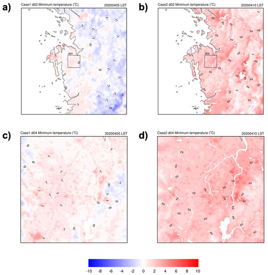 WRF-simulated result of daily minimum air temperature (°C) for domain 2 (a,b) and WRF–LES-simulated results for domain 4 (c,d).