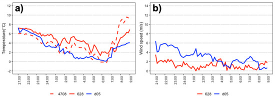 Table 3 shows WRF–LES results in domains 4 and 5 for 4–5 April 2020. The MB of the temperature varied between −0.5 and −1.75 °C (average = 0.85 °C), while the RMSE varied from 1.31 to 4.48 °C (average = 2.14 °C). For wind speeds, the minimum, maximum, and average MB were −0.13, 1.78, and 0.38 m/s, respectively, while the minimum, maximum, and average RMSE were 1.36, 2.31, and 1.88 m/s, respectively.