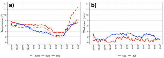 Comparison of time series of observed data at AWS (#4708 and #628) and WRF–LES simulation in domain 5 for Case 2. (a) The 2-m air temperature (°C) and (b) wind speed (m/s).