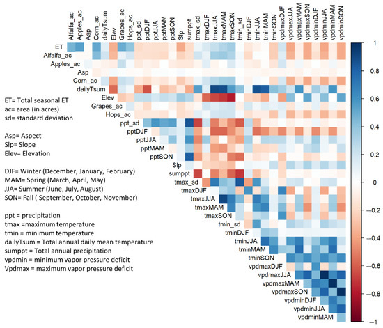 For this study, the annual growing season ET computed using METRIC was used as the response variable and watershed and climate properties were used as the predictor variables. A total of 33 predictor variables were selected based on process and basin characteristics that we assumed could affect ET (Table 2). These were derived using temperature, precipitation, crops and elevation data of the watershed. Table 2 provides detailed information about the input and response variable for the Random Forest model, while Table 3 provides the summary statistics of these variables for both training and testing dataset. Correlations between these predictor variables and their correlation with seasonal ET are shown in Figure 2. While summer maximum temperatures, summer maximum vapor pressure deficits, and crop acreage have higher positive correlation, spring minimum vapor pressure deficits and elevation show a slightly higher negative correlation with ET. These variables are expected to perform better in the random forest model. The correlation plot provides the idea about which predictor value could be deterministic in predicting the ET. However, as RF methods model non-linear relationships which may not be apparent from a linear correlation, we used all the predictor parameters for initial model development and implemented a variable selection routine to select the final variable set.