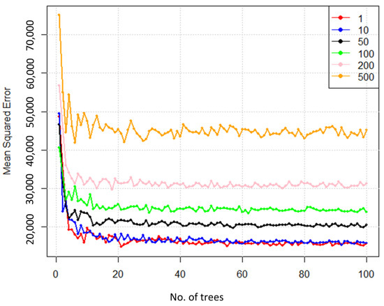 The next step in model development was selection of model parameters. Variable selection and tuning of model parameters were done using the Variable importance plot and tuneRF method available in the “randomForest” R package [62]. Among all of the variables used in the model, a subset was chosen based on their effect on reduction of Mean Square Error. (MSE) provided as the variable importance plot by the Random Forest package. Since model errors do not decrease significantly after the addition of around 17 variables we selected those 17 variables for our final model. Similarly based on output of tuneRF (Figure 3), we selected tuning parameters the maximum number of terminal nodes (maxnodes) as 10 and number of trees for the forest (ntree) as 100. Since we have a smaller dataset increased number of trees does not affect the computational efficiency and choosing a greater number of trees ensures that every input row gets predicted at least few times.