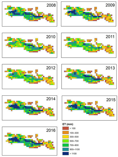 Figure 4 depicts the METRIC ET values for the growing seasons of 2008–2016 at 4 km scale. METRIC ET was computed at pixel size of Landsat imagery (30 m), but for the purposes of developing the statistical model, it was upscaled from 30 m to 4 km by calculating total ET from each agricultural pixel with the 4 km grid. The spatial variation of evapotranspiration within the watershed and between different years is evident. Evapotranspiration is affected by both climate and supply systems. From Figure 4 we can observe that there are reductions in ET during non-drought periods which could be attributed to the effects of climate change. Similarly, the effects of the supply system on consumptive use are also evident as there are relatively higher ET values on the northern side of the watershed, which is served by the Roza Irrigation District.