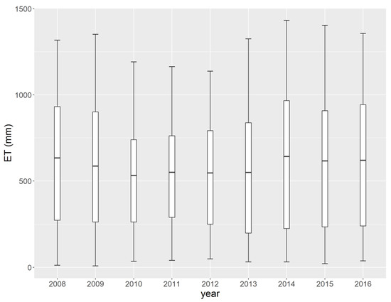 Figure 5 presents the boxplot of the METRIC ET across the study period. From the figure, we can observe that the test dataset of 2015–2016 are in the range of the training dataset of 2008–2014. Since RF model can predict within the range of input variables only. We can expect that the good performance of RF model on test and training dataset. Similarly, variation in the distribution of ET across the years will help in the generalization of the model.