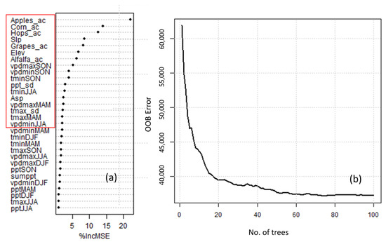 We used the Random Forest (RF) [56] algorithm to develop a predictive model for our study as it has been used to predict climate change effects [57,58] and has been shown to perform better than similar other machine learning techniques Fernández-Delgado et al. [59]. RF has been successfully used in similar activities such as predicting the effect of climate change on species distribution [57,58] and land use/cover classification [60,61].