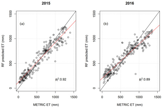 Performance of RF model to predict METRIC ET for 2015 (a) and 2016 (b). The red line on each subplot is the fitted line and the black line is the line of slope of 1.