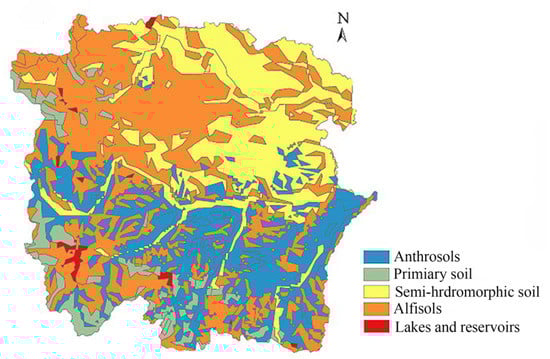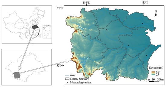 The Huaihe River is an important geographical dividing line in China and a transition belt between southern and northern parts (Figure 1) [41]. The north region of the Huaihe River is located in a warm-temperate zone, and the south is located in a north subtropical zone [42,43], The various soil types are dominated by alfisols, anthrosols, lakes and reservoirs, with primary soil and semi-hydromorphic soil. Hydrothermal conditions play an essential role in the growth of crops, and the overall environment is suitable for the crops to grow on. The field near the Huaihe River Basin (HRB) is fertile mainly yielding wheat, maize, and potatoes, and is one of China’s grain production areas [44]. The study area in the upper reaches of the HRB is approximately 3.1 × 104 km2, surrounded by numerous rivers and tortuous topography.