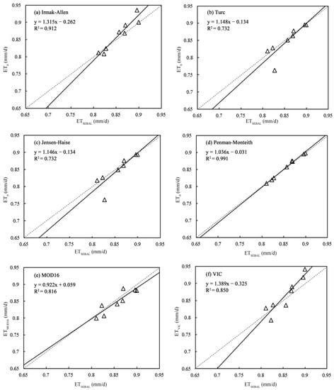 Comparison of daily evapotranspiration from the SEBAL model (ETSEBAL) on 20 November 2013, versus reference evapotranspiration (ET0) obtained from Imark-Allen (a), Turc (b), Jensen-Haise (c), Penman-Monteith (d), ETMOD16 (e), and ETVIC (f). The solid line is the least-squares regression line, and the dashed line is the x = y line.