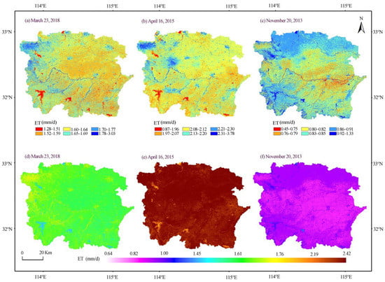 Distribution of daily ETSEBAL over the study region in March 2018 (a,d), April 2015 (b,e) and November 2013 (c,f).