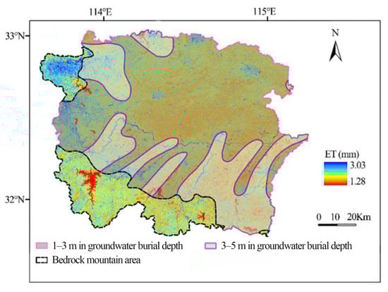 To identify the possible factors that influence daily ETSEBAL over the study region, especially in spatial heterogeneity, a superposition analysis was performed based on ET data on March 23, 2018, and raster data of groundwater depths, soil types, elevation, surface temperature, extra-atmospheric reflectance and surface reflectance. The spatial distribution of the ETSEBAL and the groundwater depths is shown in Figure 4. Results show that ETSEBAL was less for the shallowest groundwater depth at 1–3 m, high for the groundwater depth at 3–5 m and higher for the bedrock mountain area. Previous studies had different results in this regard. For example, Huo et al. [19] revealed that evaporation decreased as the water table fell by performing a lysimeter experiment incorporating a 1-year-long bromide tracer test, until it was down to the extinction depth of groundwater. Luo and Sophocleous [64] found that ET decreased with increasing depth to the water table through the HYDRUS-1D model in arid and semi-arid regions. In addition, Liu et al. [65] indicated that groundwater depth from 4 to 12 m had little effect on total evaporation in a subtropical scrub forest. Studies have shown that ET was also affected by meteorological factors and underlying surface factors [59,60,61]. The observed characteristics of the ETSEBAL maybe correlated with some of these influencing factors rather than groundwater depth in the study region.