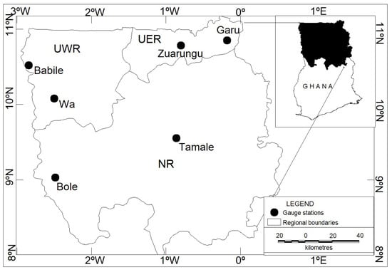 The Location of the three administrative regions and the synoptic gauge stations in Northern Ghana.