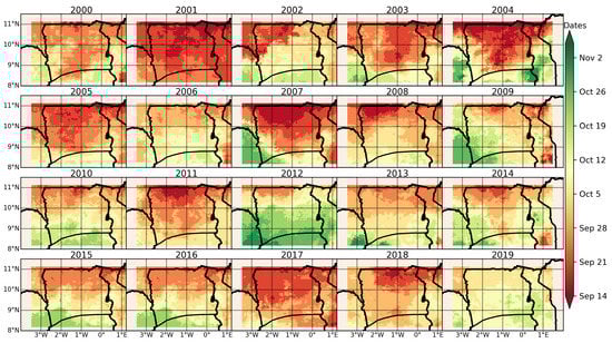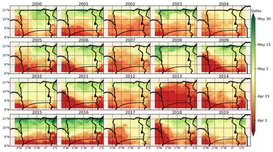 Figure 1, Figure 2, Figure 3 and Figure 4 show maps of the three seasonal rainfall indices representing the onset, cessation, and the LGP, respectively, derived from the CHIRPS-v2 data. Only maps for 2000 to 2019 seasons are shown for illustration purposes but a summary for all the years is shown in Figure A3. The rainy season’s onset showed a progression along the south-west to northeast direction, with rains starting earlier in the former (Figure 2). Exceptionally early onsets were recorded in northern Ghana in 2013 that can potentially disorient farmers given it rained at the time that farmers usually prepare their fields. Figure 2 shows cases in 2009, 2011, 2013, and 2018 where early rainfall onsets (mid-March) were observed in the NR. In 2007, and 2014 seasons we observed an early onset of rain (21st March to 15th April) covering the entire region. However, the UWR experienced more instances of the early start of rainfall than the UER. Moreover, the NR has shown the earliest onset among the three regions. The transition agro-ecological zone in the NR showed the early start of rainfall (21st March) compared to areas located closer to the UER and UWR. This could also be due to the CHIRPS-v2 poor strength along the zonal boundaries, as reported in [], which could lead to false onsets at these locations. On average, rainfall onsets occurred between 28th April to 25th May in the UER, 10th April–15th May in the UWR, and 21st March to 25th April in the NR except for exceptional seasons. Generally, the results revealed that the region’s rainfall indices have substantial latitudinal variability, with early onsets (21st March–15th April) south of 10oN latitude and late onsets (15th April–25th May) at the north of 10° N latitude.