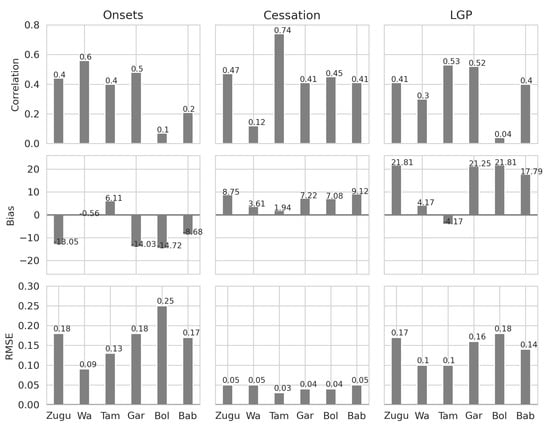 Agreement between CHIRPS-v2 and gauge data in representing the rainfall onset, cessation, and LGP at the six stations from 1981 to 2016. Performance was measured using Pearson correlation (r), Bias, and root-mean-square errors (RMSE). Station names are like Figure 6.
