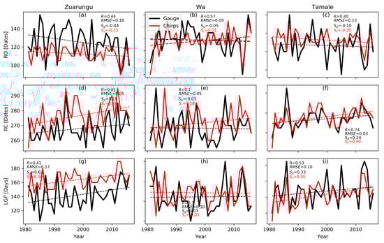 where LGP is the length of the growing period, RC is the rainfall cessation, RO is the rainfall onset. The time series rasters of the three seasonal rainfall indices (onset, cessation, LGP) were applied to test null hypothesis (no trend) from the entire time series data. The trends of the three seasonal rainfall indices were determined using Theil Sen’s slope estimator ([]; Equation (2)). There are several methods for testing the significance of climatic trends such as the Mann–Kendall test [,], Spearman’s rho test [,] and graphical method []. Existence of serial autocorrelation and ties in time series of climate data influence the magnitude of variance of the test statistic []. We plotted the autocorrelation function (ACF) to check if the time series of the three rainfall indices had serial dependency. Since the dataset did not show significant serial-dependence (Figure A2), the significance of the trends was then tested using Mann–Kendall test [] at a significant value of 0.05 (Equations (3)–(5)). The ability of the CHIRPS-v2 satellite data to capture the onset and cessation dates in the UER, UWR, and NR was assessed using data from six-gauge stations (Figure 1). A point to grid approach was applied, whereby rainfall for the six-gauge stations was extracted and matched with geolocated satellite data. Where a particular station’s data were missing, nearby station’s data were used to gap-fill. This is because stations that are close to each other, not greater than 4 Km apart, have been revealed to have similar rainfall patterns. After that, the onsets, cessations, and LGP for both gauge and satellite at these stations were computed and compared. To validate the indices’ captured by satellite data in the UER, UWR, and NR, the index’s average for the two stations that fell in each region was computed for gauge and satellite and compared.
