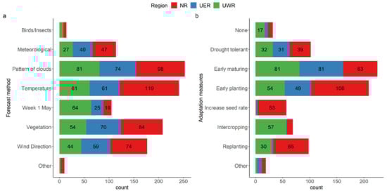 Figure 10b shows the crop management practices applied by farmers to adapt to shifts of onset and cessation dates of rainfall in the three regions. The early maturing cultivars, early planting, drought-tolerant cultivars and replanting emerged the most common but with different intensities across the three regions (Figure 10b). Planting early maturing cultivars is a strategy to cope with shortened LGP. Early planting enables crops to take advantage of every drop of soil moisture at the onset of season. The UER and eastern NR experienced longer LGP resulting from early-onset and late-cessation dates, therefore, planting early and medium-late maturing varieties are viable adaptation measures in that part. However, in the UER fewer farmers applied early planting (49) compared to early maturing varieties (81) reflecting adaptations that are mis-aligned to local reality. However, the situation was the opposite in the NR. Therefore, adaptation measures were not always consistent with the rainfall seasonality. Similarly, Ref. [] noted the blanket recommendations policies on the adoption of early maturing crop varieties where seasons are becoming longer in northern Ghana led to maladaptation outcomes that increased vulnerability to climate change and variability. Farmers in UER respond to delayed onset and shortening of LGP by spreading out the sowing of crops across the first three months of the season through a wait-and-see or delay strategy [,]. They sow the drought-tolerant crops (sorghum and millet) in April to take advantage of early rains. Farmer’s shift sowing of drought-sensitive crops (maize, rice, and groundnut) from May to June or July to reduce the risk of exposure to early season drought. However, this can increase the risk of exposure to the late-season dry spell since these crops mature after 3–6 months. In addition to, the timing of rainfall seasons, selecting appropriate adaptation measures needs to consider the significant spatial-temporal trends of rainfall amount and temperature reported in northern Ghana [,].