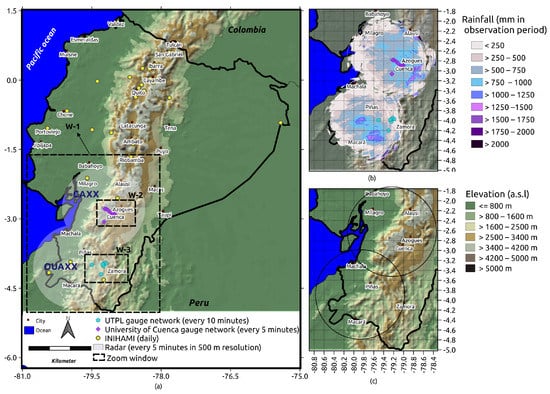 - Rollenbeck, R.; Bendix, J. Rainfall distribution in the Andes of southern Ecuador derived from blending weather radar data and meteorological field observations. Atmos. Res. 2011, 99, 277–289. [Google Scholar] [CrossRef]