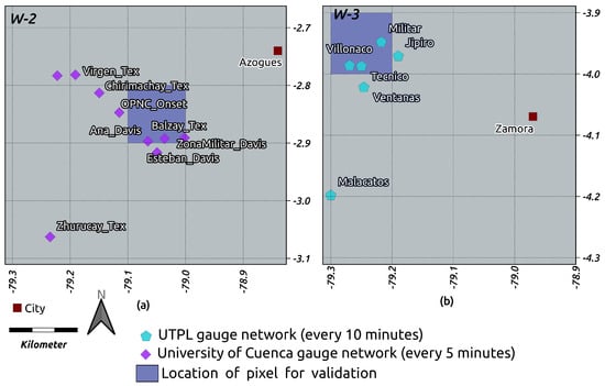 Location of pixels with a minimum number of three gauges for (a) the University of Cuenca gauge network and (b) the UTPL gauge network. In Figure 1a, W-2 and W-3 rectangles outline the extent of (a) and (b), respectively.