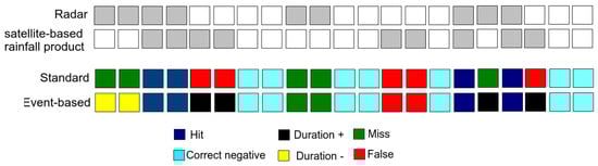 Schematic view of how H, M, and F were designated in the rain area validation. The dry pixels are shown in white, and the rainy pixels are shown in grey. The standard approach defines M (F) when a rainy pixel in the radar (satellite-based rainfall product) is related to a dry pixel in the satellite-based rainfall product (radar) at the same time. In the temporal event-based approach (fourth row), the M (F) in the vicinity time of hits are defined as a reduction (continuous) in the event duration. Thus, the terms Duration+ (Duration-) are described. True misses and true false alarms are the errors occurring simultaneously or in the same pixel, respectively [17].
