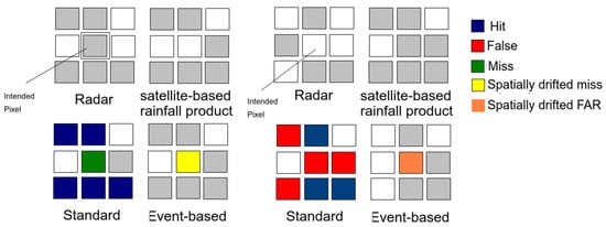 Schematic view of how hits, misses, and false alarms are designated in the rain area validation. The dry pixels are shown in white, and the rainy pixels are shown in grey. The standard approach defines M (F) when a rainy pixel in the radar (satellite-based rainfall product) is related to a dry pixel in the satellite-based rainfall product (radar) at the same time. In the spatial event-based approach (second row), the M (F) in the neighboring pixels are defined as a spatially drifted miss (false alarm) of the event. The errors simultaneously and in the same pixel are called true misses and false alarms, respectively.