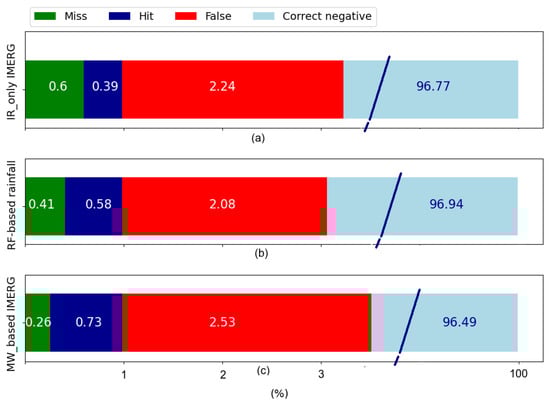 The frequency of occurrence of the cross-table components formed on all available MW overpass timing (n = 51,384) is presented in Figure 5. Less than 5% of the MW overpass times in either radar or satellite-based rainfall products contain rainfall and a total of 0.73%, 0.58%, and 0.39% are hits for MW-based IMERG, RF-based rainfall, and IR-only IMERG, respectively. Successively, false alarms dominated the error with a fraction of 2.53% for MW-based IMERG, 2.08% for RF-based rainfall, and 2.24% for IR-only IMERG. All three product show reasonable agreement with the radar at the time of MW overpass Table 2. All products have a high FAR (0.78 for MW-based IMERG and RF-based rainfall, and 0.85 for IR-only IMERG).