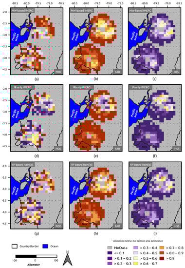 A few studies have investigated the performance of satellite-based rainfall products over Ecuadorian areas. The Precipitation Estimation from Remotely Sensed Information using Artificial Neural Networks (PERSIANN) [14] shows low agreement with rain gauge in daily resolution [2] in rain area detection. Manz et al. [15] investigated the performance of the integrated multi-satellite retrievals for GPM (IMERG) [5] and TRMM multi-satellite precipitation analysis (TMPA) [6] against gauge data with different temporal resolutions (hourly, 3 h, and daily). In their study, IMERG showed better agreement than TMPA, especially on the high elevation of Andes. Erazo et al. [16] reported that at high elevations in the Andes, TRMM 3B43 Version 7 retrievals showed a higher correlation (R2 = 0.82) on monthly compared with interpolated gauge data at a spatial resolution of 27.75 km2. The result of the validation of the regionally developed algorithm in Ecuador, the random forest-based rainfall (RF-based rainfall) of Turini et al. [3] with an 11 km2 resolution, obtained a median Heike skill score (HSS) around 0.35 for daily gauge stations, meanwhile the lower performance of the IR-only from the IMERG (IR-only IMERG) showed by HSS = 0.2. In their method, they used the Random forest algorithm to retrieve rainfall. In this text, the RF-based rainfall stands for the rainfall retrieval from random forest algorithm [3]. The RF-based rainfall retrieval performed in estimating the rainfall rate with correlation coefficient (r) values 0.34 [3].