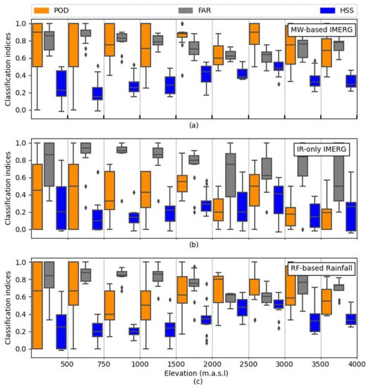 Figure 7 provides an overview of the validation metrics of the three satellite-based rainfall products for rain area delineation, along with the altitude. All products have a high FAR and a convincing POD. The performance at a terrain elevation of approximately 0–1500 m.a.s.l is relatively lower for all of the three products with HSS of 0.2–0.29 for MW-based IMERG, 0.1–0.22 for IR-only IMERG, and 0.2–0.25 for RF-based rainfall. The rain area delineation performance increased until 3000 m.a.s.l. At 0–750 m.a.s.l, the RF-based rainfall (HSS = 0.25) performs the best of all products.