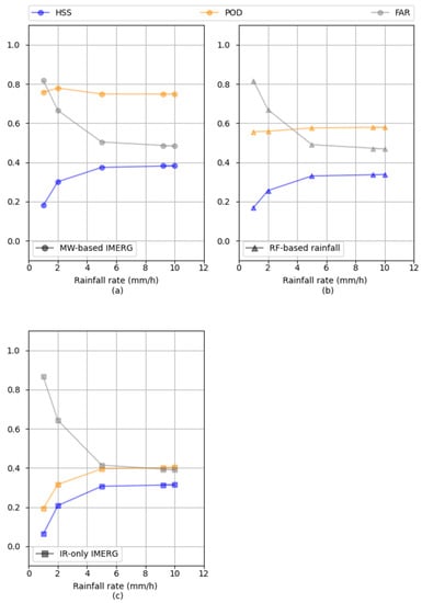 The rain area delineation performance over the MW overpass time and at 11 km2 for different rainfall rates for (a) MW-based IMERG, (b) RF-based rainfall, and (c) IR-only IMERG.