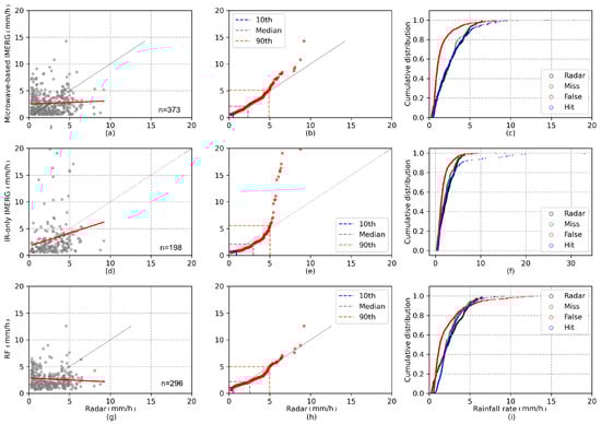 Comparison of rainfall rates estimated by the radar and satellite-based products. (a,d,g) Scatter plot with radar rainfall rates (x-axis) and microwave-based IMERG, IR-only IMERG, and RF-based rainfall rates (y-axis), respectively. Only pixels with hits are considered. The parameters n show the total number of hits. (b,e,h) Quantile–quantile (Q–Q) plot of the radar (x-axis) and microwave-based IMERG (y-axis), IR-only IMERG (y-axis), and RF-based (y-axis) rainfall rates. The 10th, 50th, and 90th percentiles are illustrated. (c,f,i) The distribution of cumulative rainfall rate for the contingency table of each satellite-based product. The radar rain rate is displayed in black as a reference.