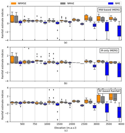 Figure 10 provides an overview of the validation metrics of the three satellite-based rainfall products for rain estimation along with altitude. MW-based IMERG and IR-only IMERG have difficulty estimating rainfall at lower elevations (0–500 m.a.s.l), which is shown by the extension of the boxplot for NRMSE and NMAE in this elevation range. RF-based rainfall has relatively lower values of NRMSE, NMAE, and NME at an elevation of 0–500 m.a.s.l. With increasing elevation, the rain estimation performance is relatively moderate until 2500 m.a.s.l. For high terrain elevations of approximately 2500–4000 m.a.s.l, all products show a significant uncertainty, mainly in NME. All the products underestimate the rainfall rate at high elevation (2000–4000 m.a.s.l).