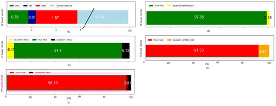 (a) Standard contingency table approach for all available RF-based rainfall products for both radars at 2 km2 and 30 min. Note that the correct negative fraction extends to 100%. (b,c) The temporal event-based approach of the contingency table was evaluated in the M and F subsets, respectively. (d,e) The spatial event-based approach of the contingency table was evaluated in the M and F subsets, respectively. The numbers in the bars show the percentage.