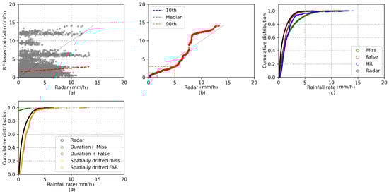 Comparison of rain rates estimated by the radar and RF-based rainfall at 2 km2 and 30 min. (a) Scatter plot with radar rainfall (x-axis) and RF-based rainfall (y-axis). Only the pixels with hit are considered. (b) Q–Q plot of radar (x-axis) and RF-based rainfall rates (y-axis). The 10th, 50th, and 90th percentiles are illustrate. (c) The distribution of cumulative rainfall rate for the contingency table. (d) The distribution of cumulative rainfall rate based on the event-based (spatial and temporal) contingency table.