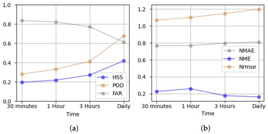 Comparison of the validation metrics between the radar and RF-based rainfall at 2 km2 and 30 min, 1 h, 3 h, and daily. The performance of RF-based (a) rain area delineation and (b) rain estimation is shown for different temporal resolutions.